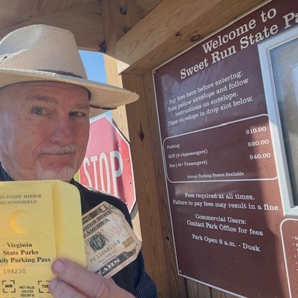 Sweet Run State Park was the hidden gem we didn’t know we needed. Fall colors, 13 miles of easy to rugged trails, a pioneer cabin in the woods, and Service Dog Charlie making friends at every turn. Even the “great stream-crossing drama” was worth the detour. Sometimes the best days start with a gravel road and ten bucks in an envelope.